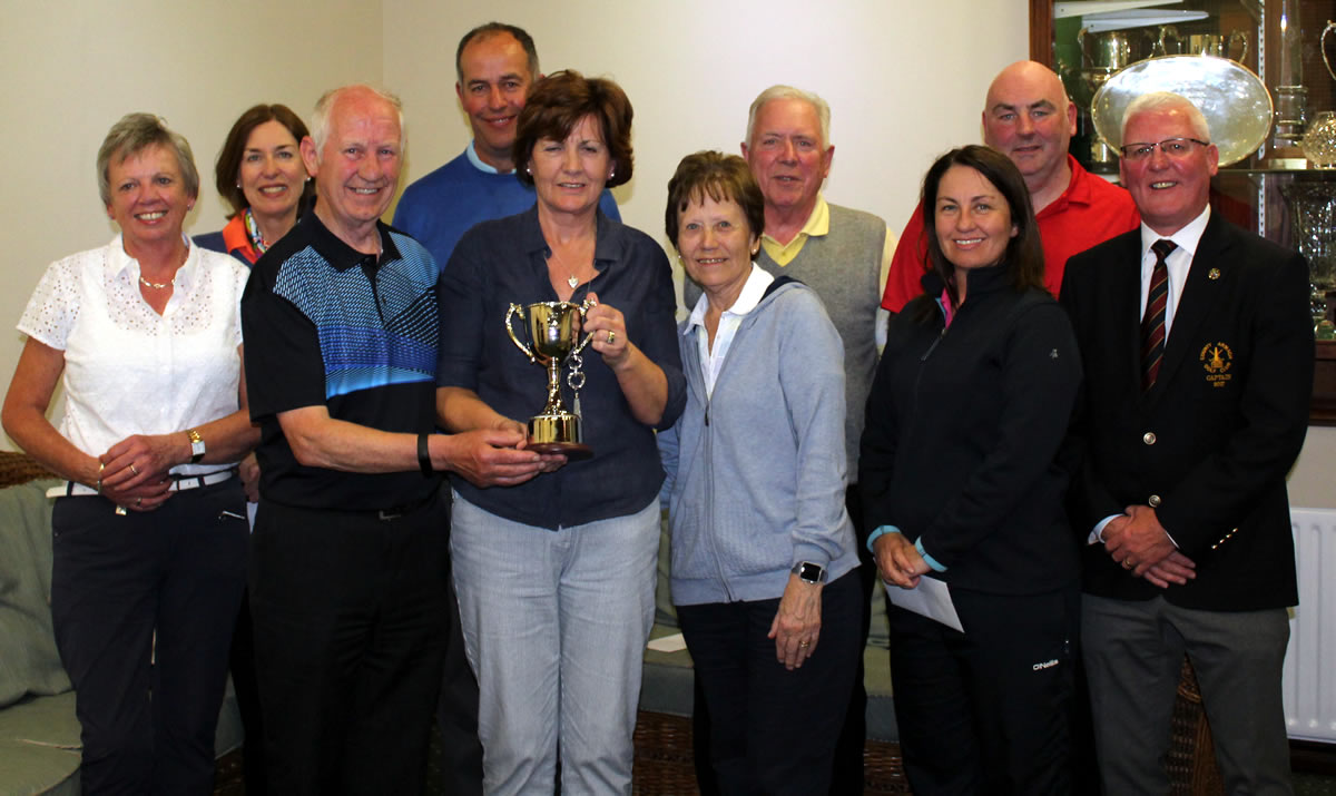 County Armagh Golf Club Captain Richard Stewart presents the John O'Neill Memorial Salver to Mixed Greensomes competition winners Mary Black and Jerome Leer. Included also are runners up Anthony Conlon and Cathleen Mone, Sean Dougan and Ann McDonald and Hilary Johnston and Stewart Stevenson, Gross Prizewinners.